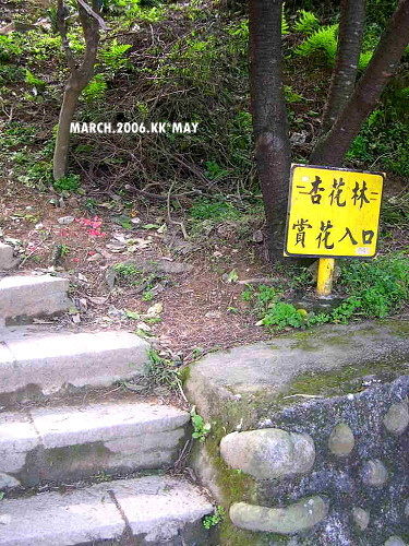 杏花林入口附近都停滿了車輛,還有一樹盛開的山櫻,經由這幾接階梯就可爬上這一小階階梯就可以進入杏花林了。