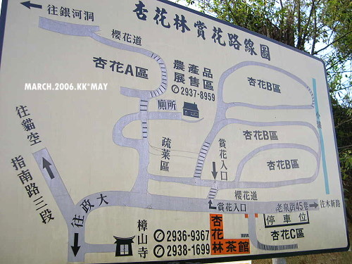在網路上看到木柵杏花林的消息,已經是2月初的事了,想想經歷過幾回鋒面來襲,或許早謝光了,不過就是忘不了照片上的滿山杏花,遊人的閒坐愜意,每到週末就直嚷著要K帶我去一趟木柵。這天K從鹿港處理完身份證的事回到台北,已經是下午兩點了,查詢一週天氣預報,週六晴時多雲,週日雨......每次都這樣,不管,今天一定要去。